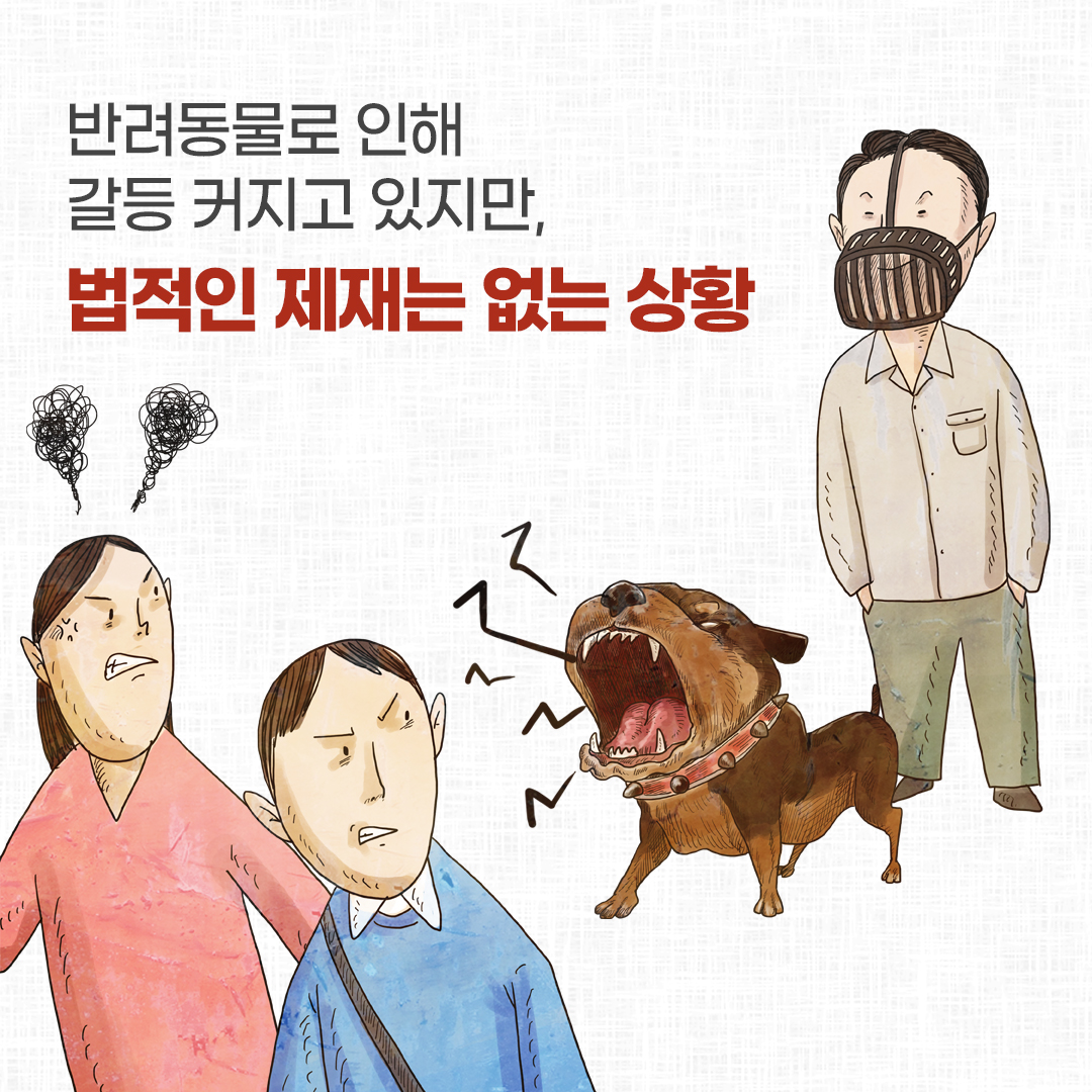 이렇듯 반려동물로 인해 갈등이 커지고 있지만, 공동주택 내 반려동물 사육에 대해선 법적으로도 제재가 할 수 없습니다. 공동주택관리법 시행령 제19조(관리규약의 준칙) 2항에서는 ‘입주자 등은 가축(장애인 보조견 제외)을 사육하려면 관리주체의 동의를 받아야 한다’고 규정하고 있으나 법률적인 제한은 없습니다.